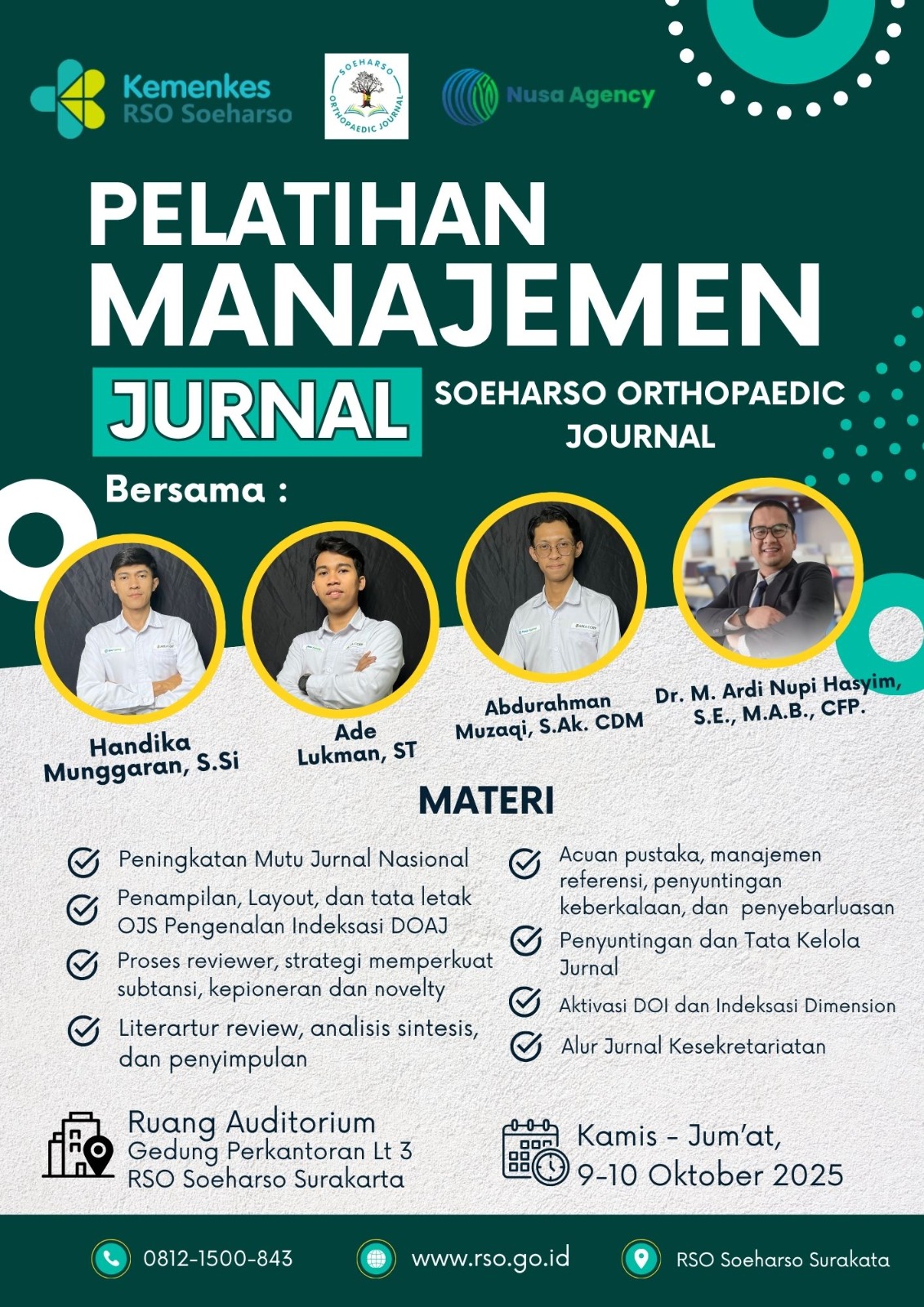Rumah Sakit Ortopedi Prof. Dr. R. Soeharso berkomitmen menjadi pusat unggulan dalam layanan, pendidikan, dan pengembangan ilmu pengetahuan di bidang ortopedi. Namun, hingga saat ini belum tersedia sistem publikasi ilmiah internal yang kredibel dan terakreditasi. Kondisi ini menghambat kontribusi rumah sakit dalam publikasi nasional serta berpotensi memperlambat pengakuan keilmuan dan reputasi institusi secara akademik.