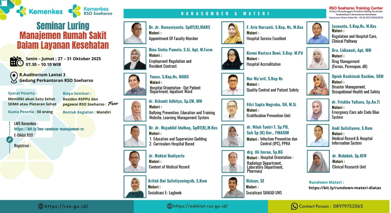 Oleh karena itu, seminar Manajemen Rumah Sakit dalam Layanan Kesehatan diselenggarakan bagi pegawai baru dan residen RSPPU RSO Soeharso sebagai salah satu memperkuat kompetensi non – klinis yang mendukung praktik profesional di masa depan, sekaligus bertujuan untuk membekali para pengambil keputusan dengan pengetahuan, alat, dan strategi terkini agar rumah sakit dapat menjalankan fungsinya sebagai institusi pelayanan kesehatan yang bermutu, efisien, dan berkelanjutan di tengah dinamika sistem layanan kesehatan.